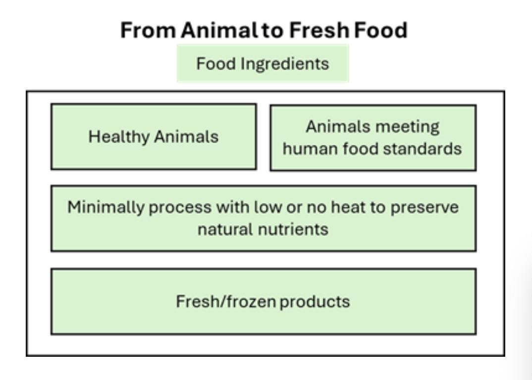 Fresh pet food starts at the farm or ranch, where ingredients are raised and grown, and make their way to the pet food plant as ingredients you recognize. Ingredients that are also sold as human food have been inspected to human food standards prior to arriving at the pet food plant. Ingredients are minimally processed to preserve natural nutrients. Virtually all fresh food products contain “limited ingredients” since they do not need to be as heavily supplemented as do highly processed pet foods. Finally, they are stored frozen which eliminates the need to add preservatives.