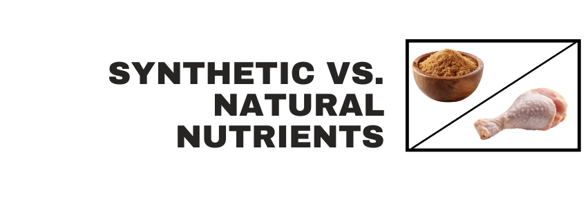 Synthetic Supplements are manufactured in laboratories and designed to mimic the nutrient developed by nature. Synthetic supplements may not contain the same ratio of nutrients found in natural sources and often have lower absorption and effectiveness in the pets’ system.